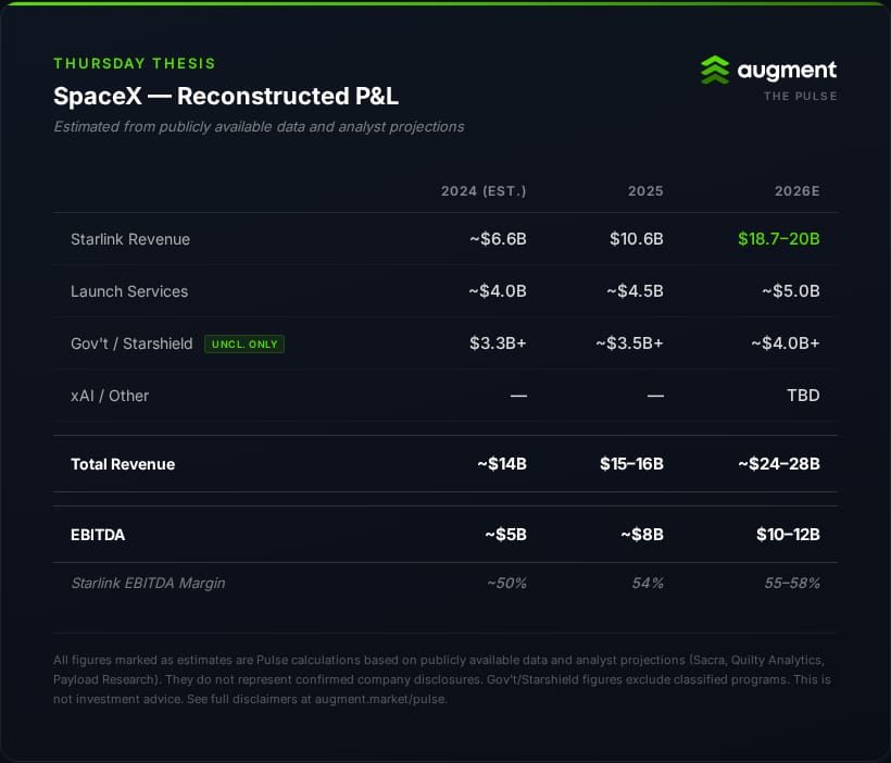 The story the numbers tell: Starlink's margin expansion is funding everything else. The consumer satellite business is approaching software-like economics — high fixed cost, near-zero marginal cost per additional subscriber — while generating the cash flow to subsidize Starship development and absorb the xAI integration. A real S-1 would likely show Starship as a massive drag on net income, offset by Starlink's accelerating profitability.