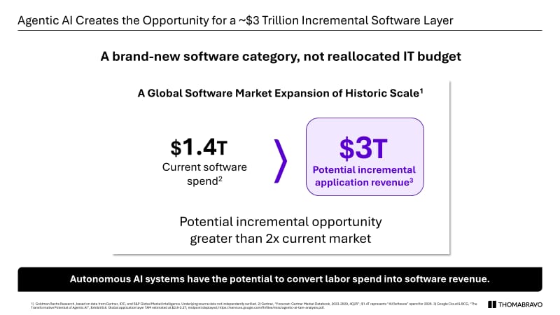 Thoma Bravo — $183 billion in assets under management, 565+ software transactions across 40 years, the largest software-focused buyout firm on the planet — held its annual LP meeting in Miami last week. Managing Partner Holden Spaht shared slides and commentary that pushed back directly on the market's blanket AI-disruption thesis.